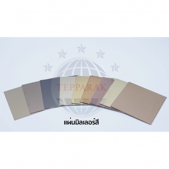 แผ่นสแตนเลสสี แผ่นสีสแตนเลส แผ่นมิลเลอร์สี แผ่นแฮร์ไลน์สี เกรด 304 เป็นวัสดุตกแต่งที่ได้รับความนิยมอย่างมากในปัจจุบัน เนื่องจากมีความสวยงาม ทนทาน และมีคุณสมบัติที่หลากหลาย เหมาะสำหรับงานตกแต่งทั้งภายในและภายนอกอาคาร สียอดนิยมได้แก่ : สีทอง (Gold) , สีโรสโกลด์ (Rosegold) , สีดำ (Black) ผิวยอดนิยม : ผิวมิลเลอร์(แบบกระจก) และ ผิวแฮร์ไลน์(แบบเส้นผม) ขนาดยอดนิยม: 4'x8' , 4'x10' ความหนายอดนิยม: 0.8 , 1.0 , 1.2 mm. *ทั้งนี้แผ่นสีที่ยิ่งมีความบางเช่น0.5-0.8mm. จะยิ่งมีความอ่อนตัว จะมีความโค้งหรือรอยบุมเล็กน้อย ซึ่งเป็นปกติของแผ่นสีแบบบาง ทั้งนี้ไม่มีผลใดๆต่อการใช้งาน **เทคโนโลยีใหม่ แผ่นสีที่มีการเคลือบผิวทำให้ลดปัญหาลายนิ้วมือ(Anti fingerprint) สามารถสั่งผลิตขั้นต่ำ 3 ตันขึ้นไปต่อสีและความหนา** ประเภทของแผ่นสีสแตนเลส: แผ่นมิลเลอร์สี (Mirror Color Stainless Steel Sheet): มีพื้นผิวเงาคล้ายกระจก ให้ความหรูหราและทันสมัย เหมาะสำหรับงานตกแต่งที่ต้องการความโดดเด่น เช่น ผนัง ลิฟต์ หรือเฟอร์นิเจอร์ แผ่นแฮร์ไลน์สี (Hairline Color Stainless Steel Sheet): มีพื้นผิวเป็นลายเส้นละเอียด ให้ความรู้สึกเรียบหรูและมีมิติ เหมาะสำหรับงานตกแต่งที่ต้องการความทนทานต่อรอยขีดข่วน เช่น ผนังลิฟต์ หรือผนังตกแต่ง แผ่นสีสแตนเลส (Color Stainless Steel Sheet): มีสีสันหลากหลายให้เลือกตามความต้องการ เหมาะสำหรับงานตกแต่งที่ต้องการสีสันที่แตกต่าง เช่น ป้าย หรือผนังตกแต่ง